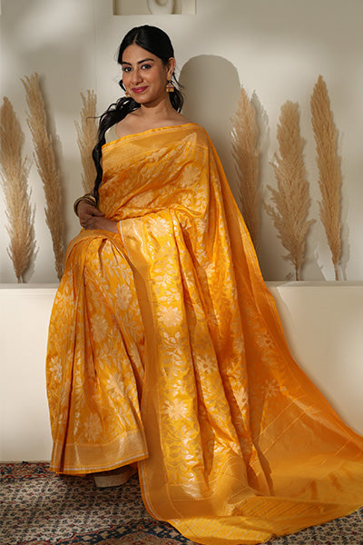 Experience the timeless beauty of a handwoven Banarasi saree, crafted in rich marigold yellow with the finesse of Jamdani artistry. Made from pure Katan silk, this drape carries a luxurious texture with delicate floral motifs woven in silver-gold zari, finished with an intricately designed pallu of floral vines.